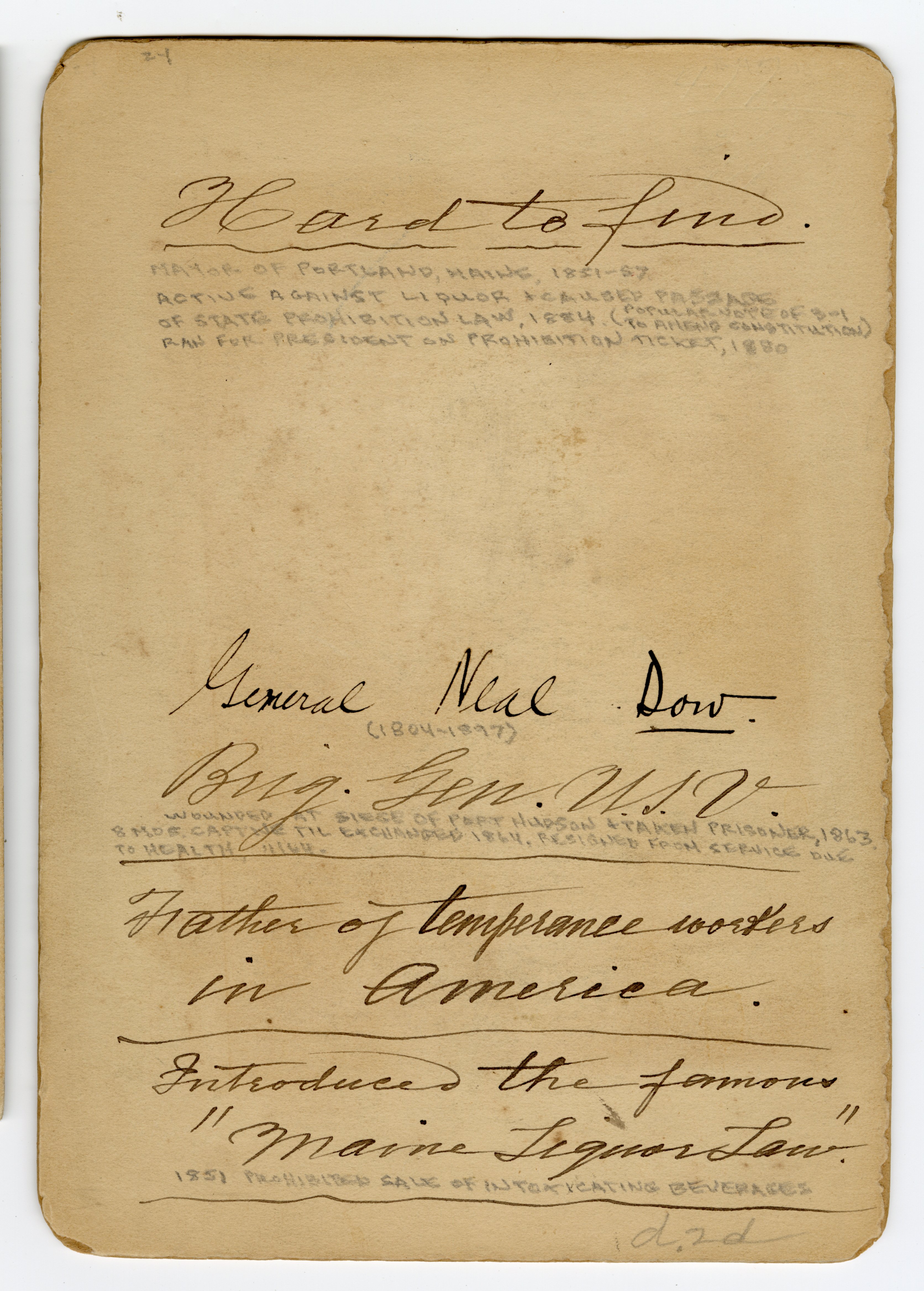 Brigadier General Neal Dow was born in Portsmouth, Me., March 20, 1804, of Quaker parentage, was educated in public schools and in the Friends, academy in New Bedford, Mass., and was trained in mercantile pursuits, succeeding to the management of his father's tannery in 1861. Early in life he became a champion of the temperance movement, and in 1851 succeeded in getting through the legislature a radical, anti- liquor law. He made many addresses on temperance throughout the state, was elected mayor of Portland in 1851 and again in 1855, and was a member of the state legislature, 1858-59.