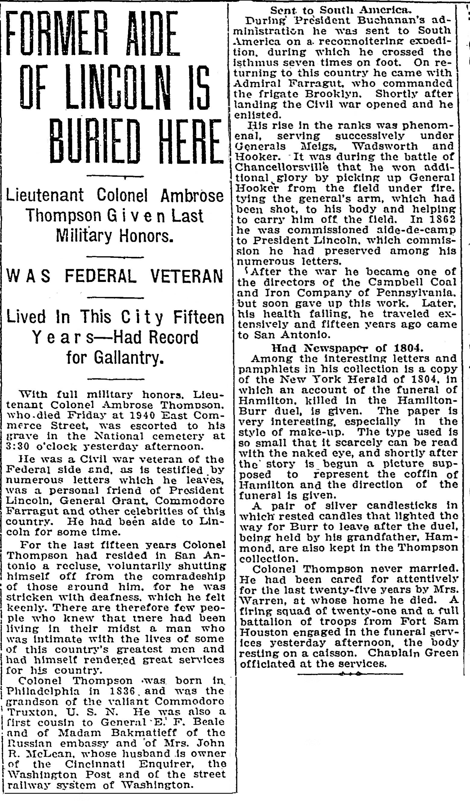 Lieutenant Colonel Thompson died March 28, 1913 in San Antonio, Texas.