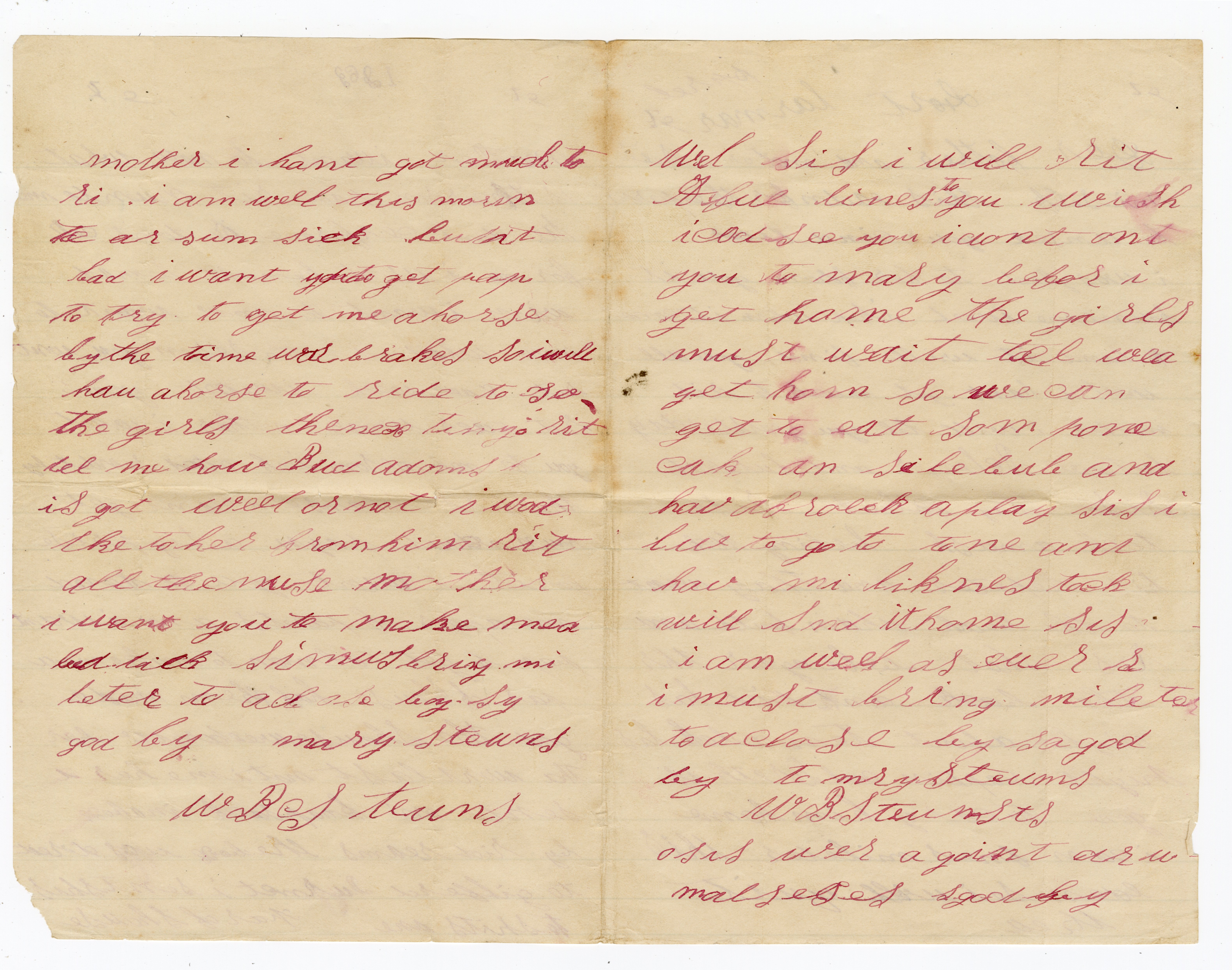 Well, Sis I will write a few lines to you. Wish I could see you. I don’t want you to marry before I get home. The girls must wait till we get home so we can eat some pone cake. Sis I leave to go to town and have my likeness taken. Will send it home. Sis, I am well as ever and I must bring my letter to a close by saying goodbye.