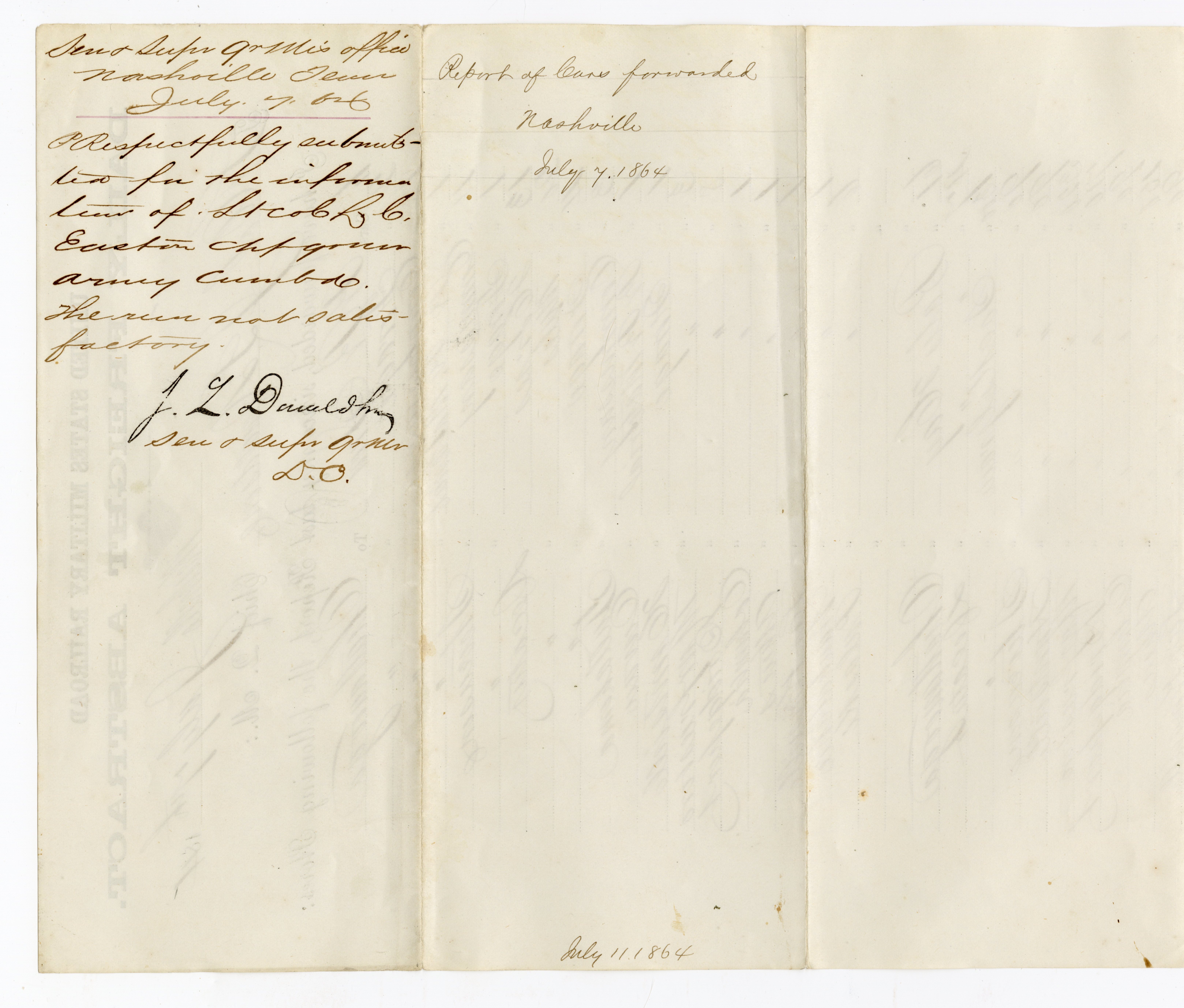 Original Civil War Military Railroad document dated July 7, 1864. Document list rail cars with cargo and destination.