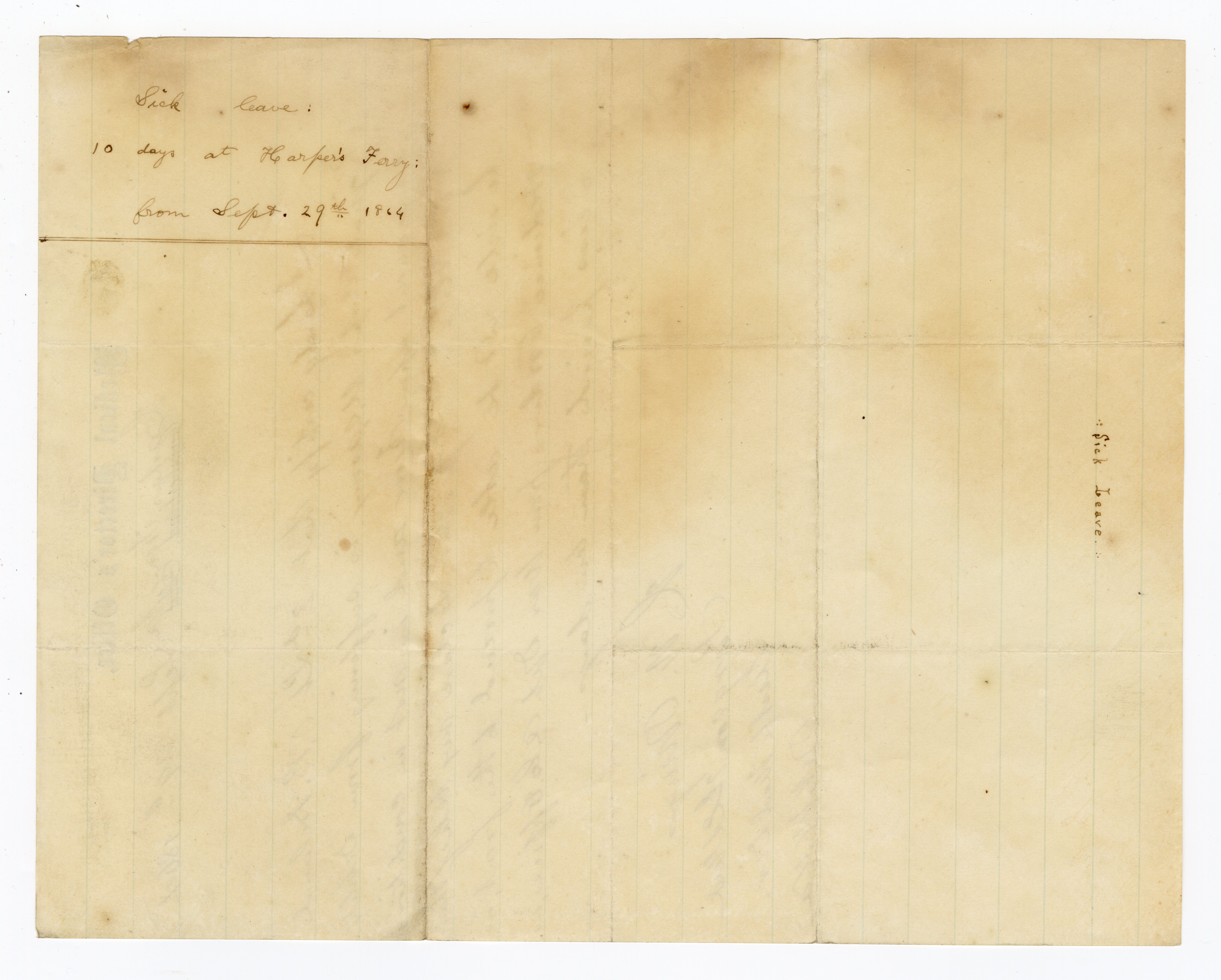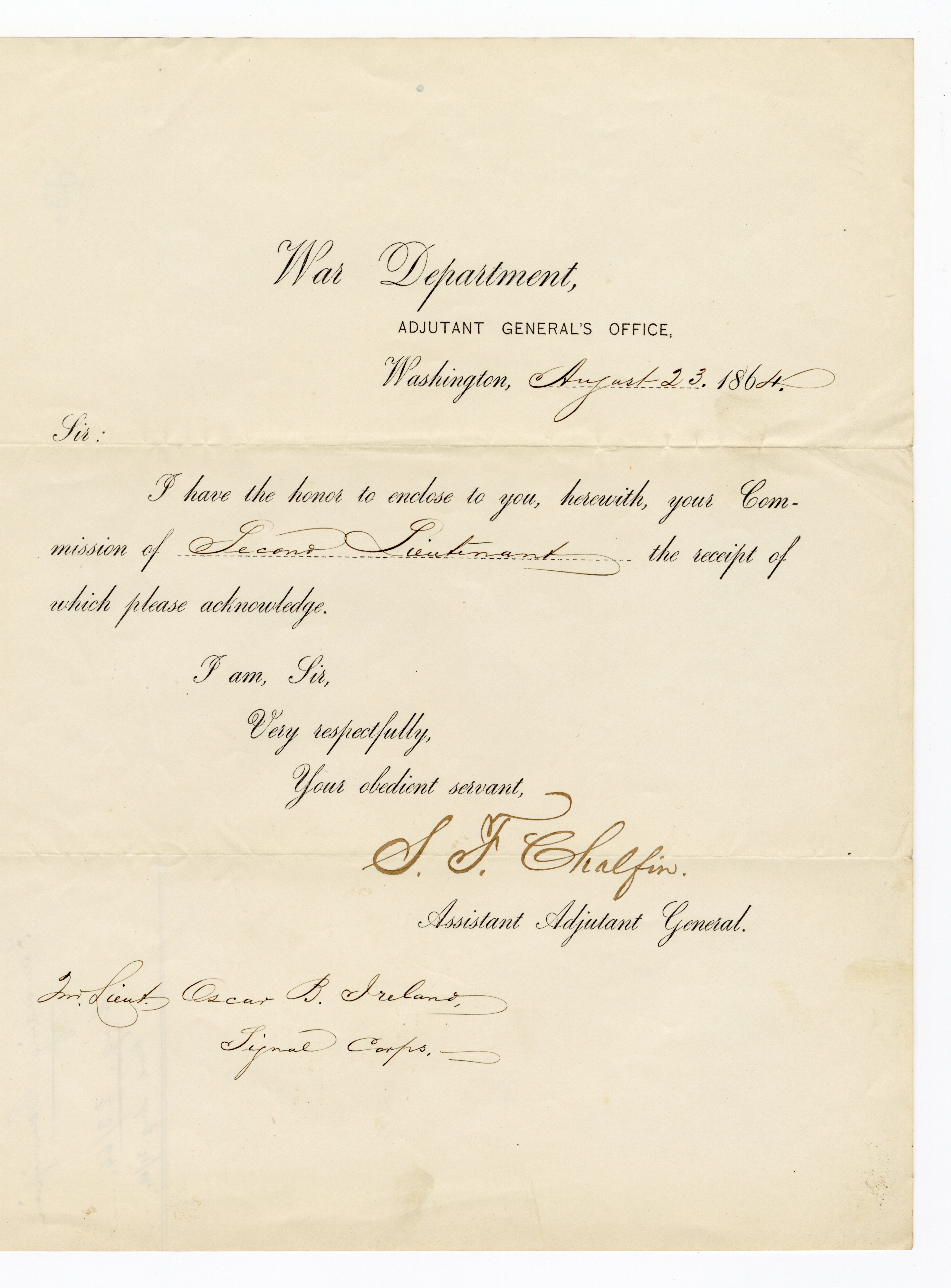 Original Civil War document discussing the medical disability of 2nd Lieutenant Oscar B. Ireland (U.S. Signal Corps). Document is signed by Surgeon Henry W. Owing of the 2nd Maryland Eastern Shore Infantry. Owing also served with the 4th Maryland Infantry.