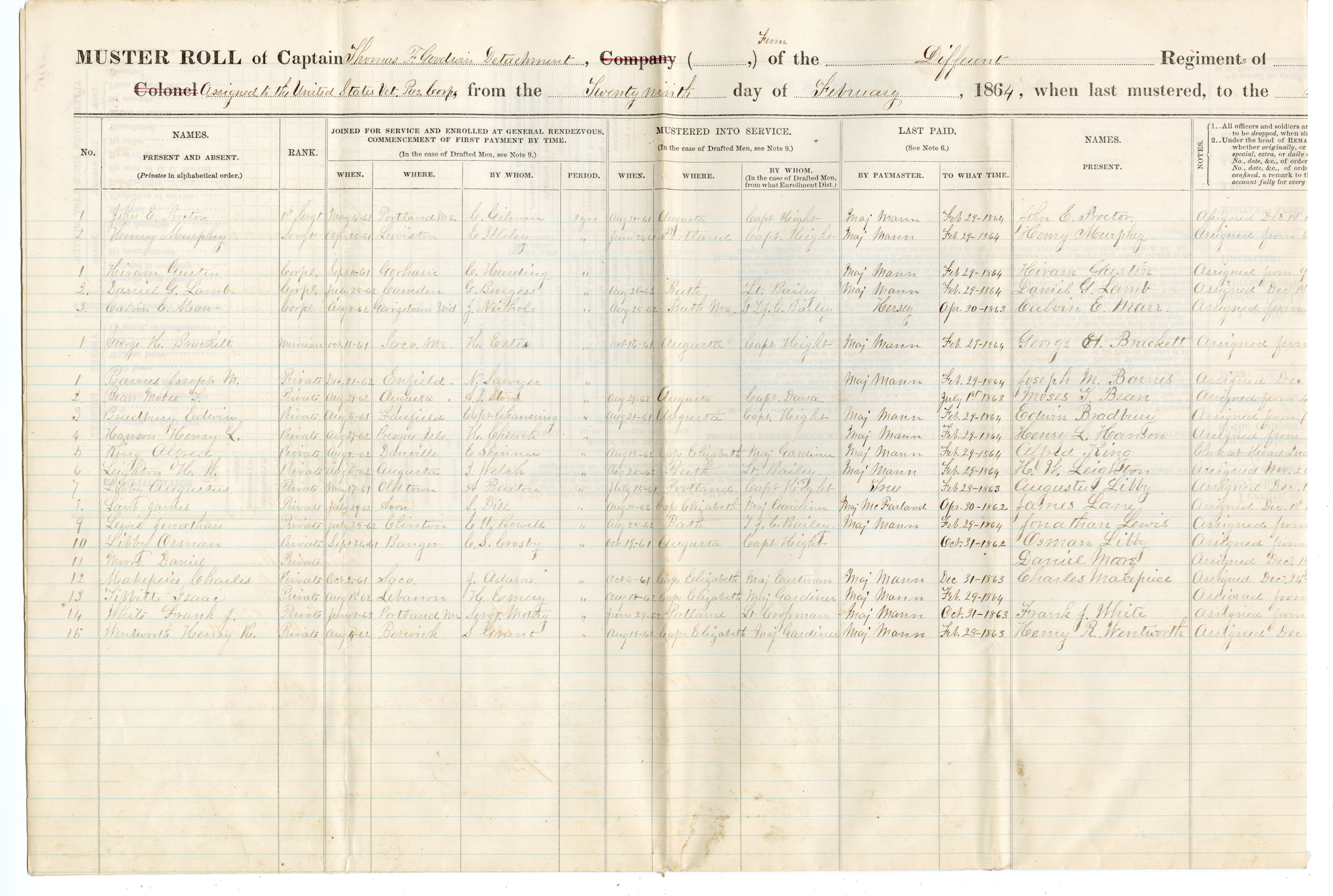 Original Civil War document, 30 ½ x 21, two-sided imprinted form, filled out in ink. Muster Roll of Detachment of the different regiments of Maine Volunteers, assigned to U.S. Veteran Reserve Corps, from the 29