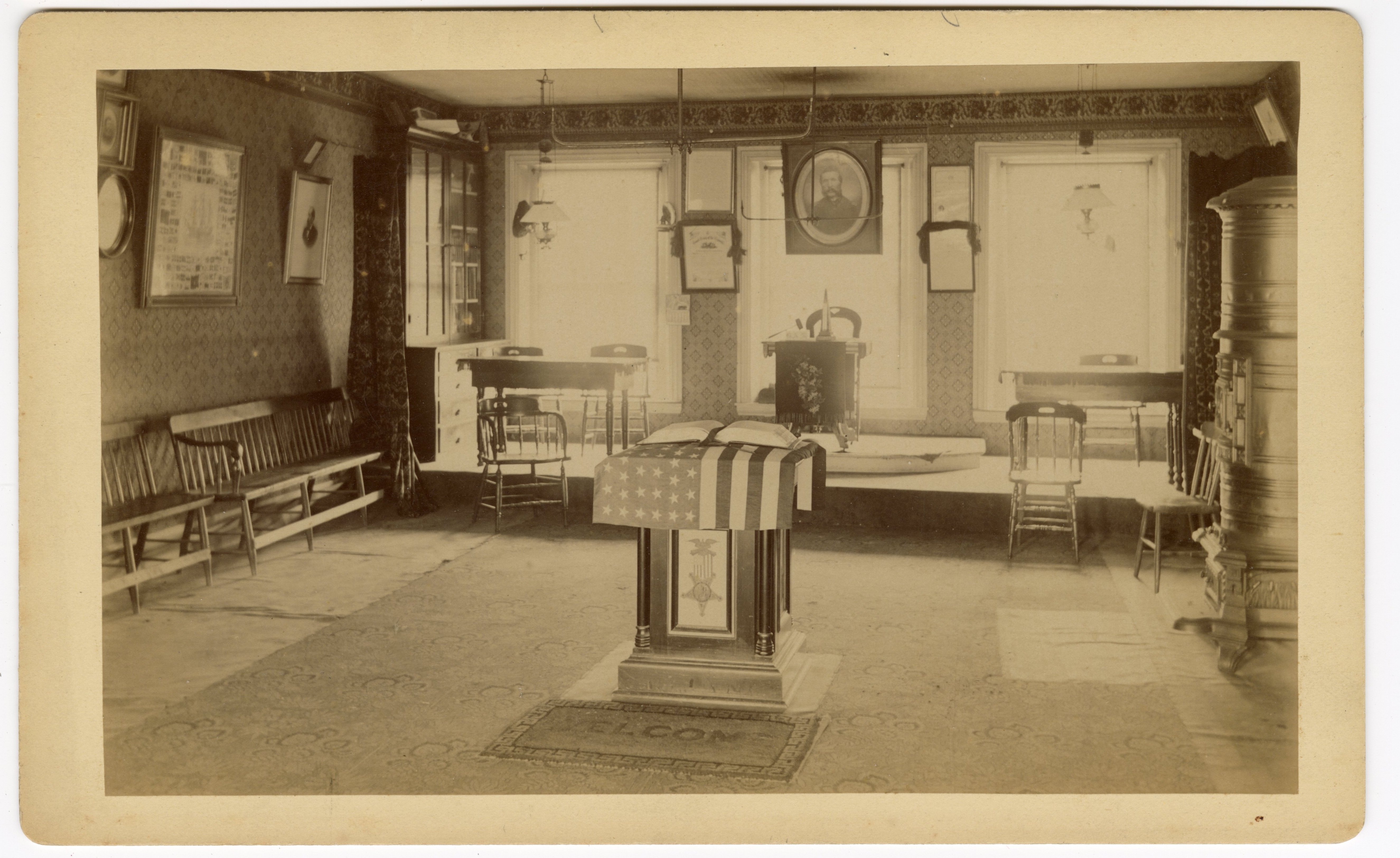 The photo is of the interior of the old Edwin Libby (4th Maine Infantry, killed in the Wilderness) Post 16 of the GAR in Rockland, Maine. The building stood at the corner of Limerock and Union Streets. Today that corner is occupied by The Firsts Bank. In the photo the large portrait of Edwin Libby can be sen on the back wall. That portrait along with the podium in the foreground and a number of the chairs in the background and several of the framed items shown on the walls are all part of the Civil War collection of the City of Rockland, Maine which is maintained by the Rockland Historical Society, of which I am a board member.