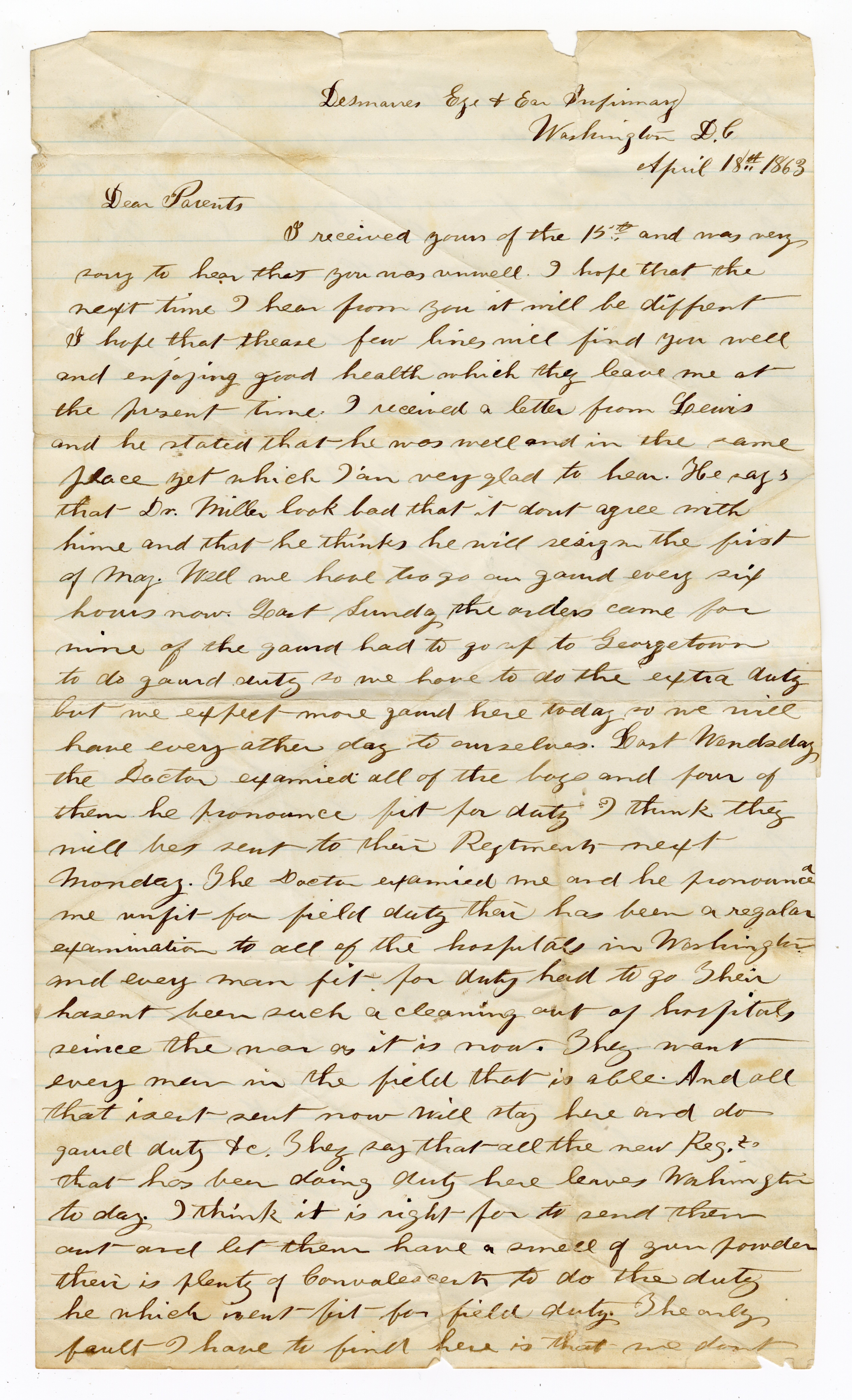 I received yours of the 15th and was very sorry to hear that you were unwell. I hope that the next time I hear from you it will be different and I hope that these few lines will find you well and enjoying good health, which they leave me at the present time. I received a letter from Lewis and he stated that he was well and in the same place yet. Which I am very glad to hear. He says that Dr. Miller looks bad. That I don’t agree with him and that he thinks he will resign the first of May. Well, we have to go on guard every six hours now. Last Sunday the orders came for nine of the guard had to go up to Georgetown to do guard duty. So, we have to do the extra duty. But we expect more guard here today, so we will have every other day to ourselves.