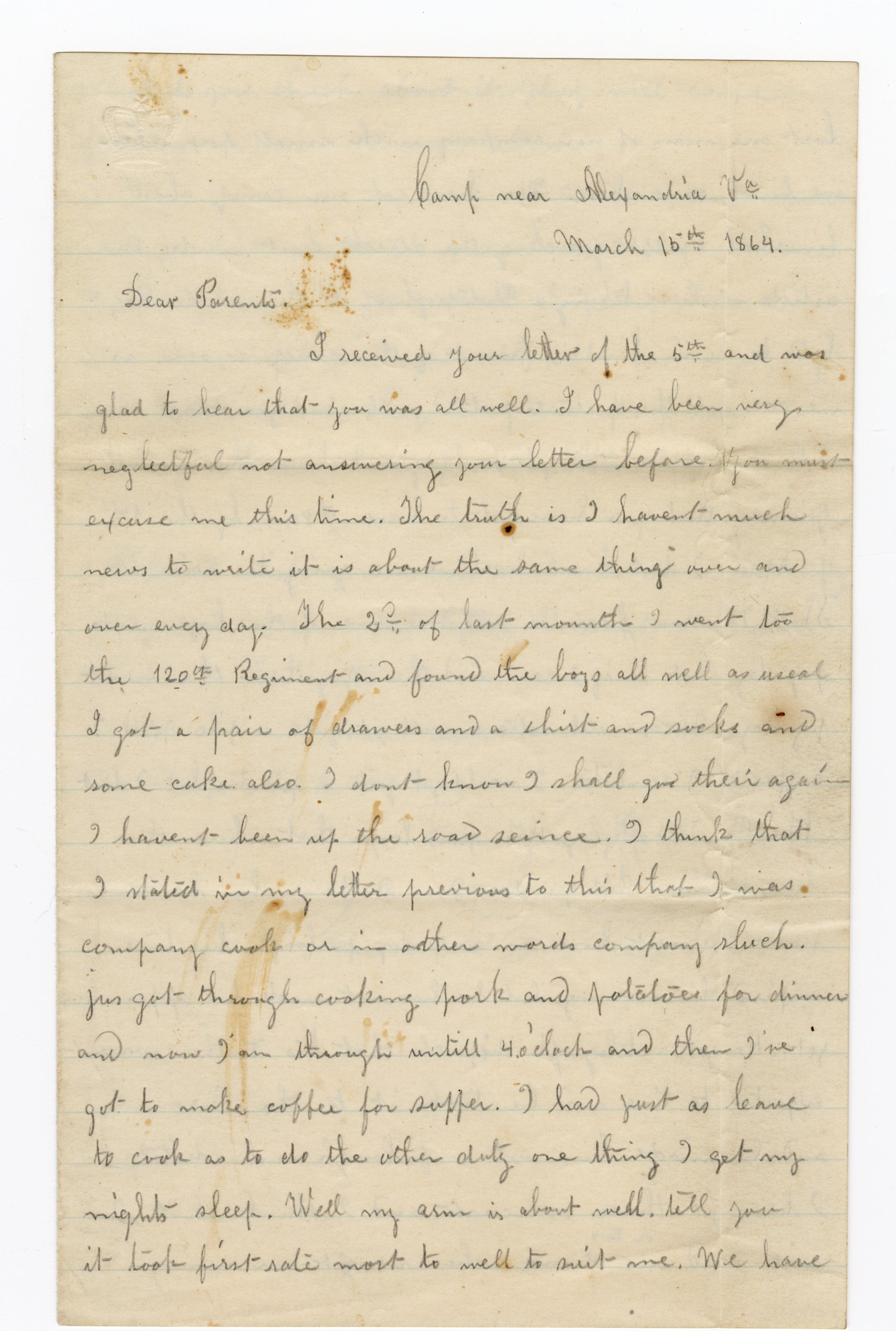 I think I stated in my letter previous that I was company cook or in other words company sluch. Just got through cooking pork and potatoes for dinner and now I’m through until 4 o’clock and then I’ve got to make coffee for supper. I had just as leave to cook as do the other duty – one thing I get my night’s sleep.