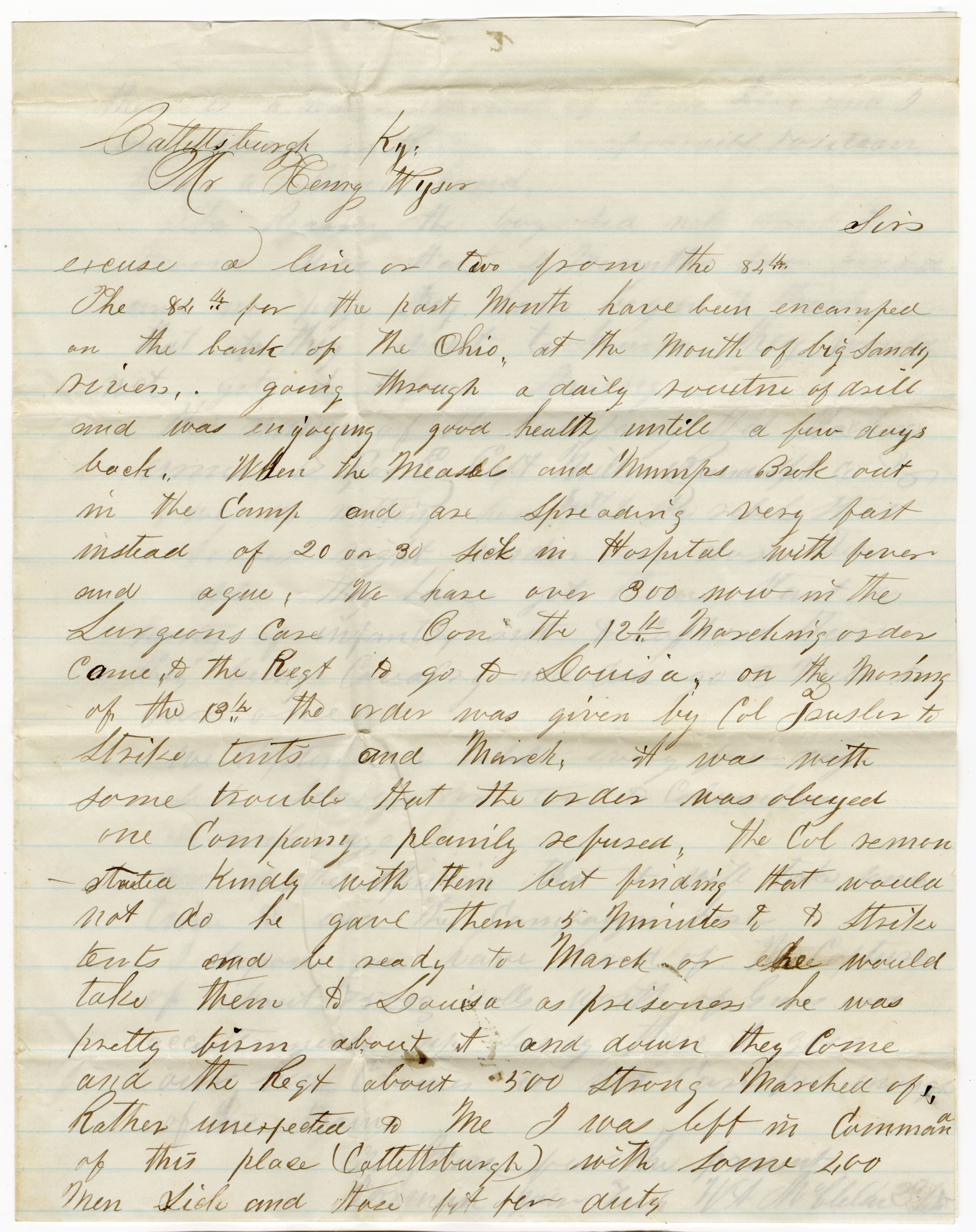 Rather unexpected to me, I was left in command of this place (Catlettsburg) with some 200 men sick and three fit for duty.