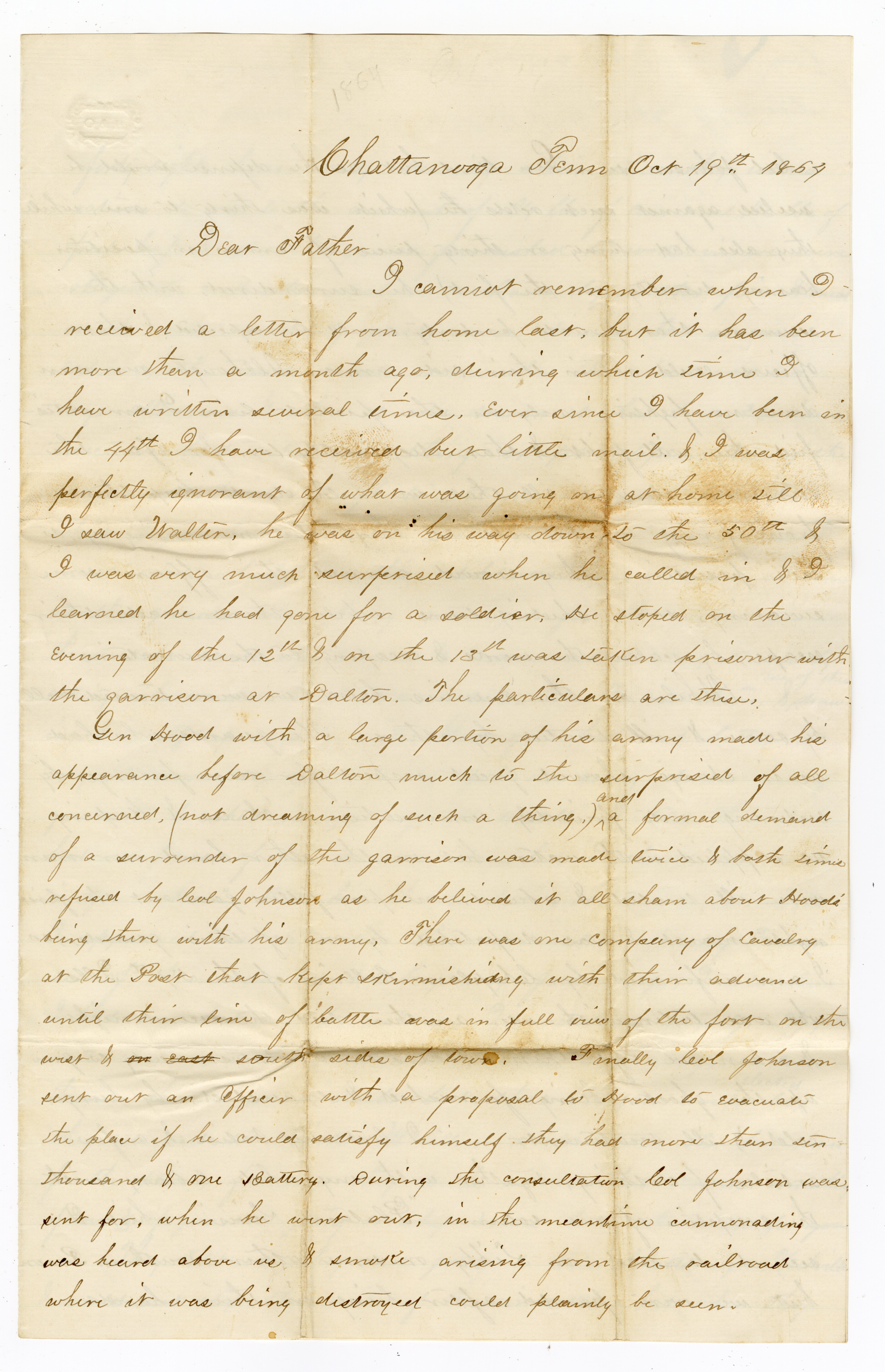 General Hood with a large portion of his army, made his appearance before Dalton much to the surprise of all concerned (not dreaming of such a thing) and a formal demand of a surrender of the garrison was made twice and both times refused by Lieutenant Colonel Johnson, as he believed it all sham about Hood being there with his army. There was one company of cavalry at the post that kept skirmishing with their advance until their line of battle was in full view of the fort on thew west and south sides of town. Finally, Col. Johnson sent out an officer with a proposal to Hood to evacuate the place if he could satisfy himself they had more than ten thousand and one battery. During the consultation Col. Johnson was sent for; when he went out, in the meantime cannonading was heard above us, and smoke arising from the railroad where it was being destroyed could plainly be seen.