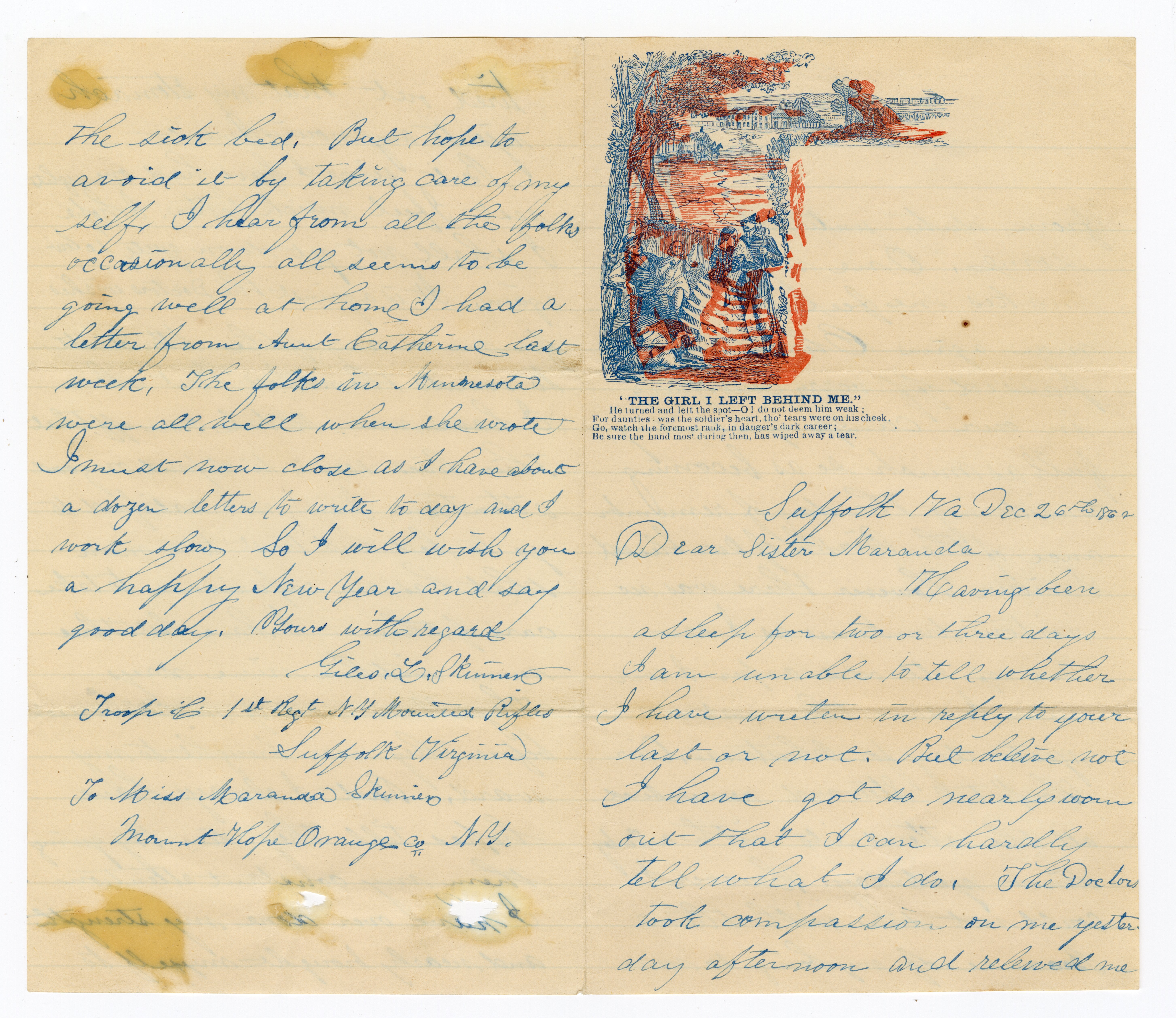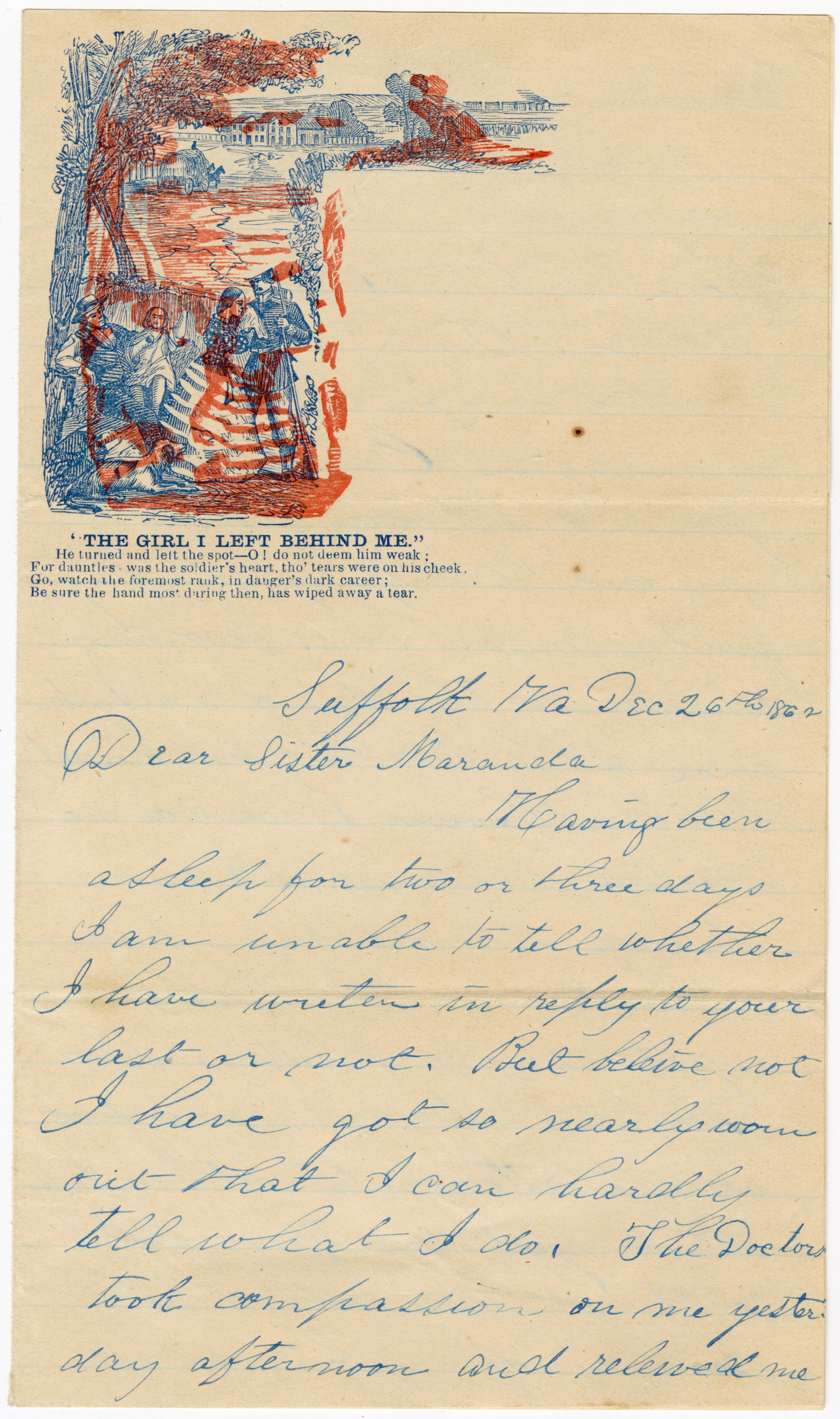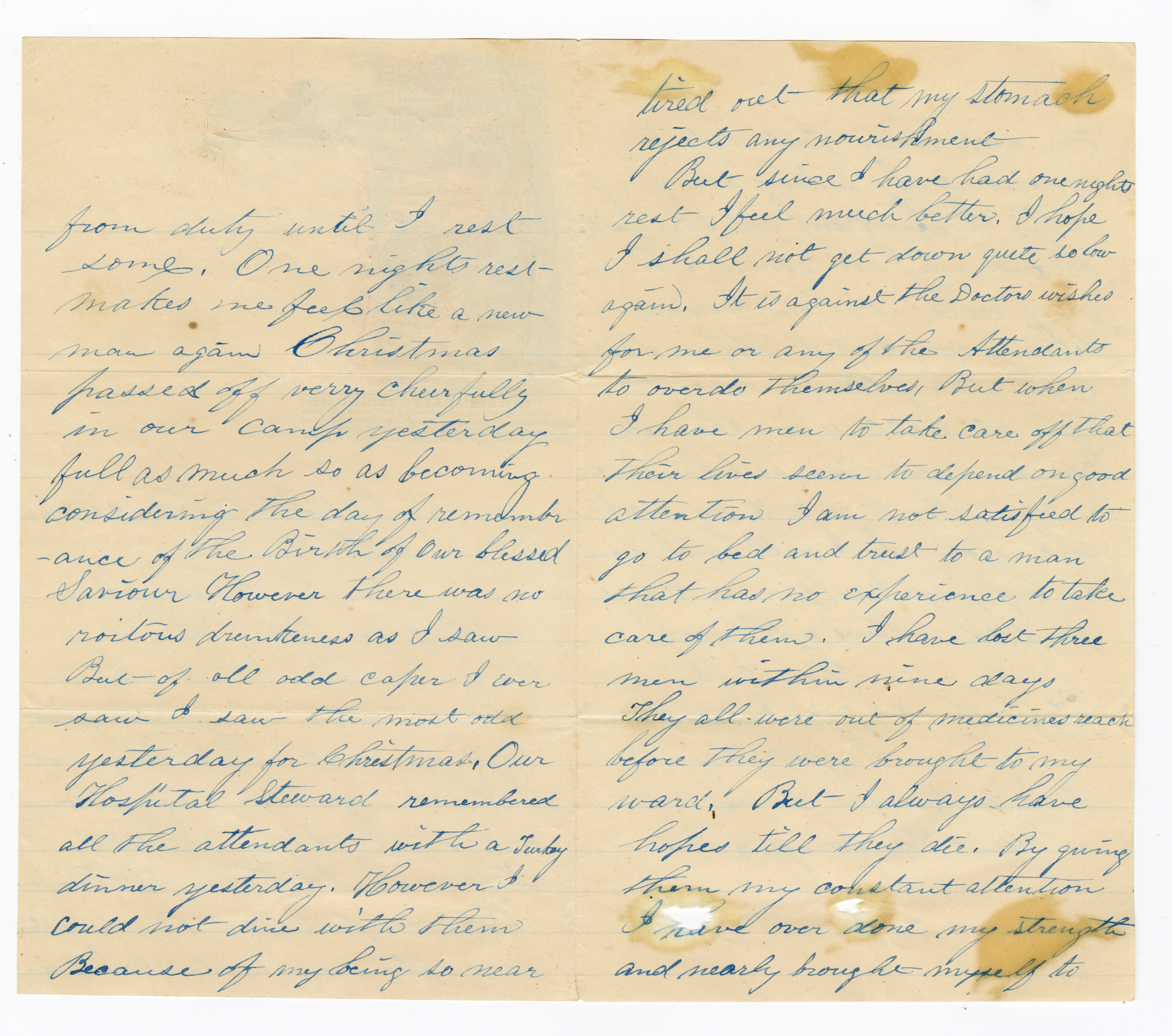 Having been asleep for two or three days I am unable to tell whether I have written in reply to your last or not. But believe not. I have got so nearly worn out that I can hardly tell what I do. The Doctor took compassion on me yesterday afternoon and relieved me from duty until I rest some. One night’s rest makes one feel like a new man again. Christmas passed off very cheerfully in our camp yesterday—full as much so as becoming, considering the day of remembrance of the birth of our blessed Saviour. However, there was no riotous drunkenness as I saw. But, of all odd capers I ever saw—I saw the most odd yesterday for Christmas. Our hospital steward remembered all the attendants with a turkey dinner yesterday. However, I could not dine with them because of my being so near tired out—that my stomach rejects any nourishment.