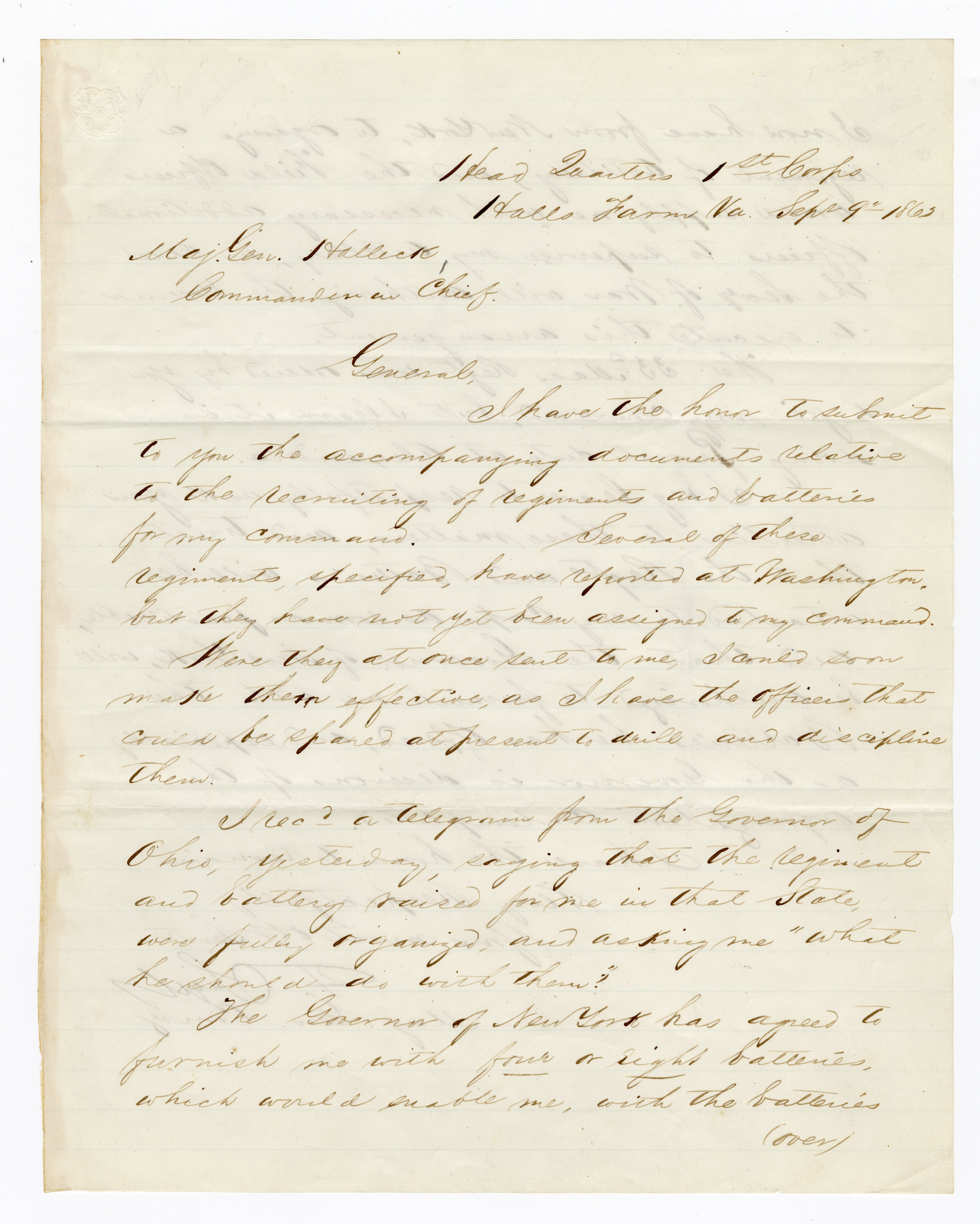 I have the honor to submit to you the accompanying documents relative to the recruiting of regiments and batteries for my command. Several of these regiments specified, have reported at Washington, but they have not yet been assigned to my command.