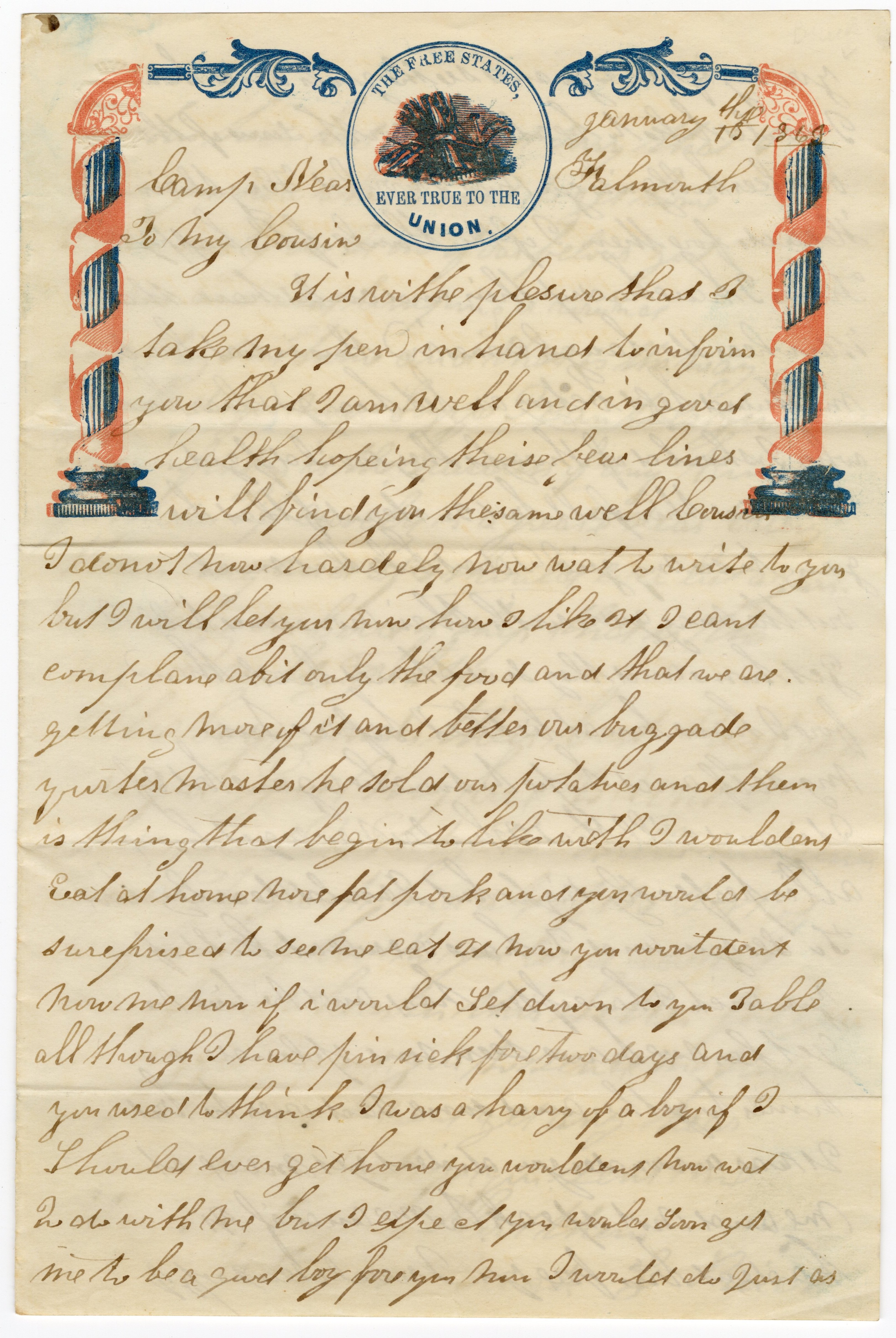 It is with pleasure that I take my pen in hand to inform you that I am well and in good health. Hoping these few lines will find you the same. Well Cousin, I do not know hardly now what to write to you. But I will let you know how I like it. I can’t complain a bit, only the food and that we are getting more of it and better. Our brigade quartermaster, he sold our potatoes and them is a thing that I began to like -- where I wouldn’t eat at home. More fat pork and you would be surprised to see me eat it. Now you wouldn’t know me now, if I would set down to your table. Although, I have been sick for two days and you used to think I was a hearty of a boy. If I should ever get home, you wouldn’t know what to do with me. But I expect you would soon get me to be a good boy for you now. I would do just as you say if was to go and see the girls and how I would like to be at home with some of the Bunker Hill girls. You know I would hug them. I often think of the happy times I have had up there and could have--that was where the laugh comes in. This is what beats me. Stuart left long ago and let her go clear board. Why I should of thought they would of got married this fall. But instead of that, he is going to see my girl. I don’t like that much. But the way they go in with their nonsense, till I go home, and they just stand back. Therefore, I have been at Bethel before now myself and hope to soon be again. But if it is God’s will that I should never get home, all is perfectly right. But I would dearly love to see you and to have one sweet kiss if you wish. We have seen some splendid times together and some sad ones too. But it was a wonder you didn’t get mad at me and not speak to me and if I hadn’t before, I wouldn’t have been here. But I am not sorry for that--I tell you when I want to get home. I can easily do that.