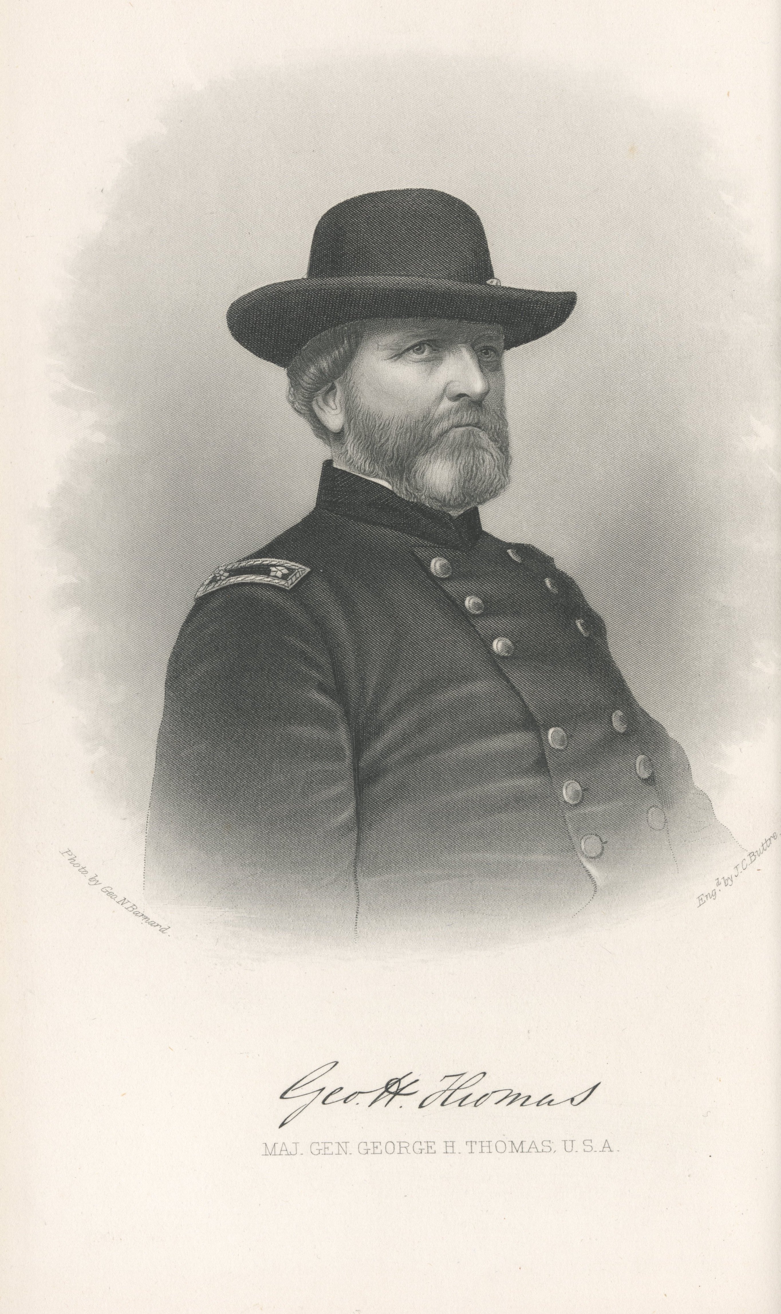 One of the principal commanders in the Western Theater of the American Civil War, George Henry Thomas served in the Mexican–American War and later chose to remain with the U.S. Army for the Civil War as a Southern Unionist, despite his heritage as a Virginian. He won one of the first Union victories in the war, at Mill Springs in Kentucky, and served in important subordinate commands at Perryville and Stones River. His stout defense at the Battle of Chickamauga in 1863 saved the Union Army from being completely routed, earning him his most famous nickname, "the Rock of Chickamauga." He followed soon after with a dramatic breakthrough on Missionary Ridge in the Battle of Chattanooga. In the Franklin–Nashville Campaign of 1864, he achieved one of the most decisive victories of the war, destroying the army of Confederate General John Bell Hood, his former student at West Point, at the Battle of Nashville.