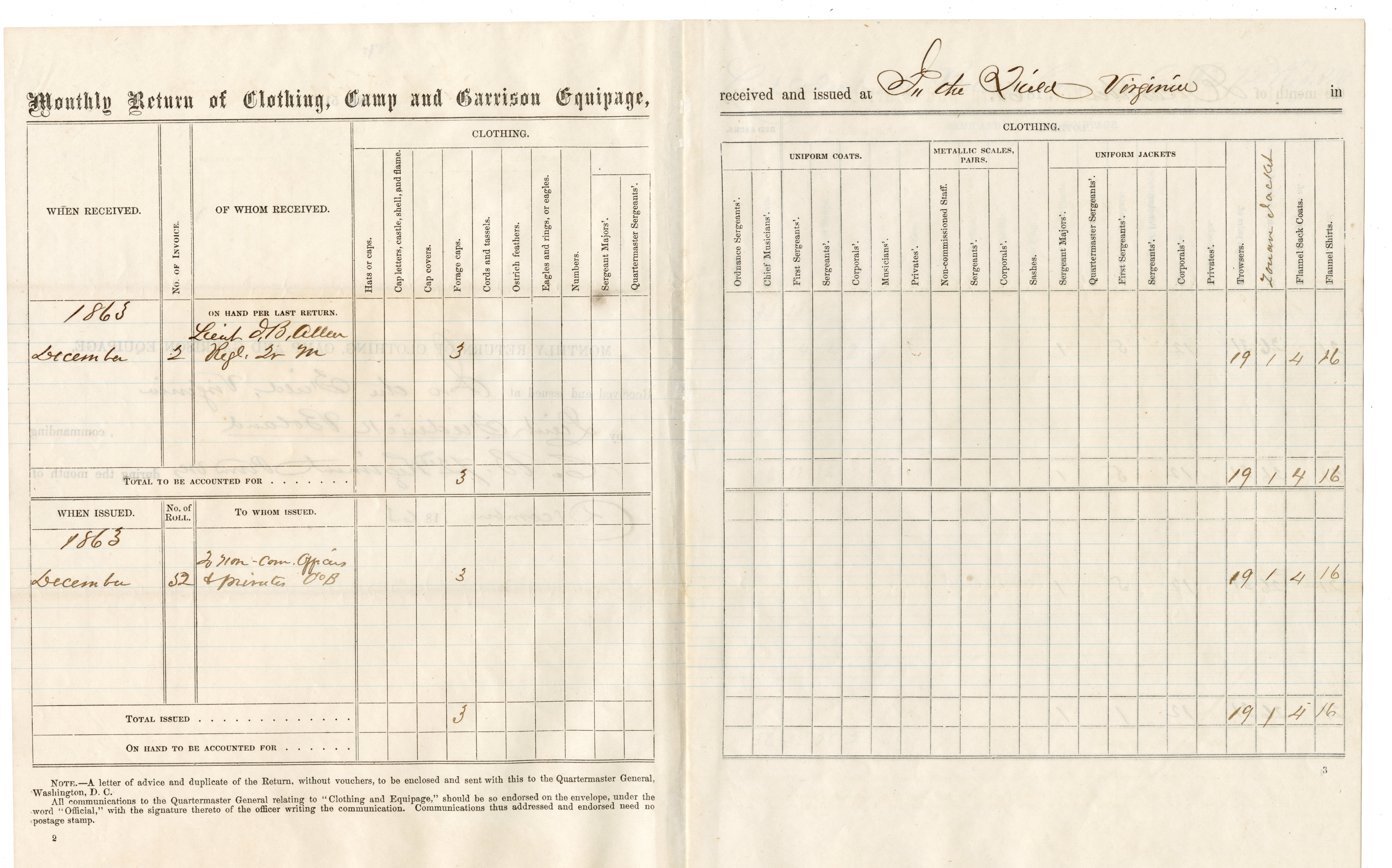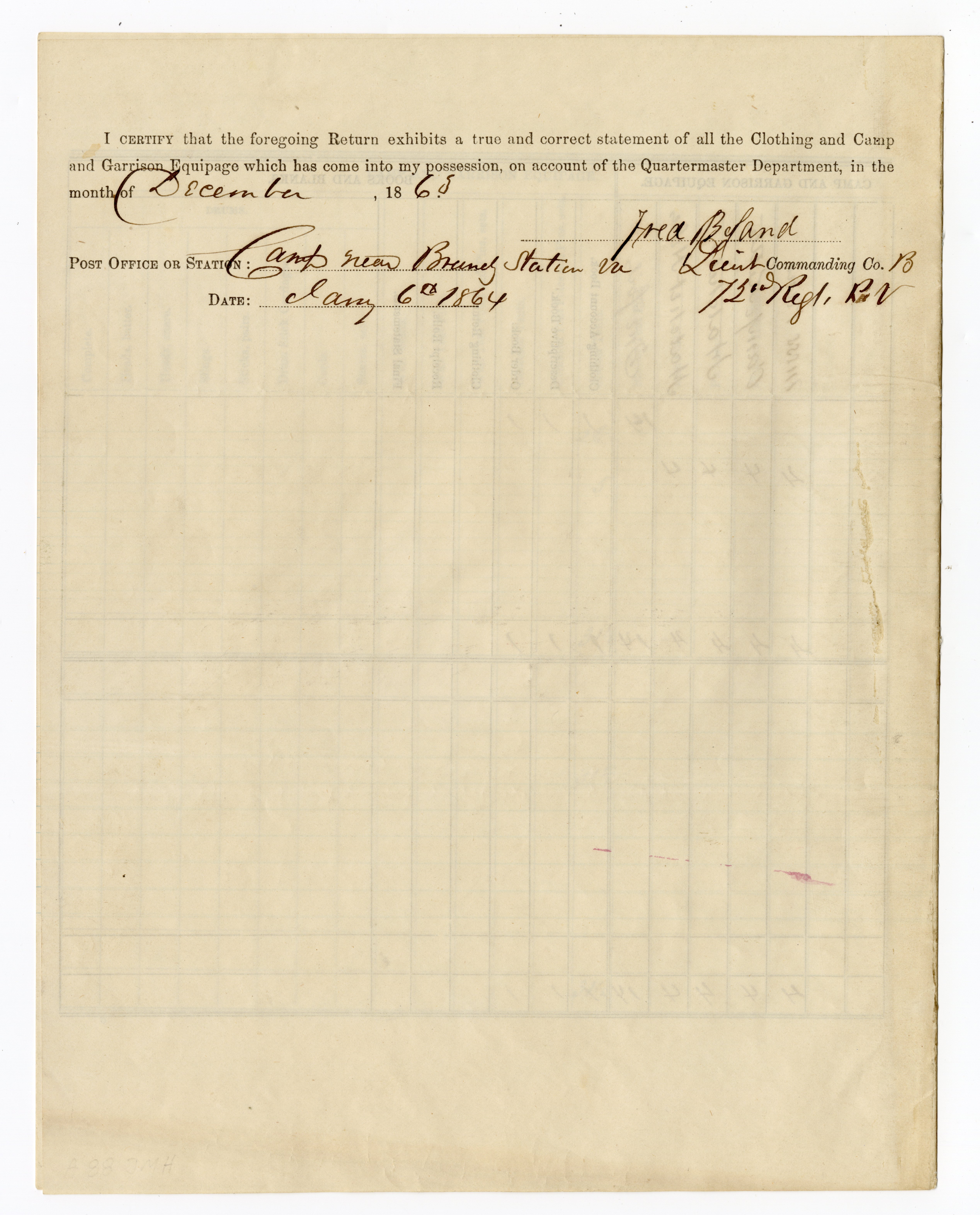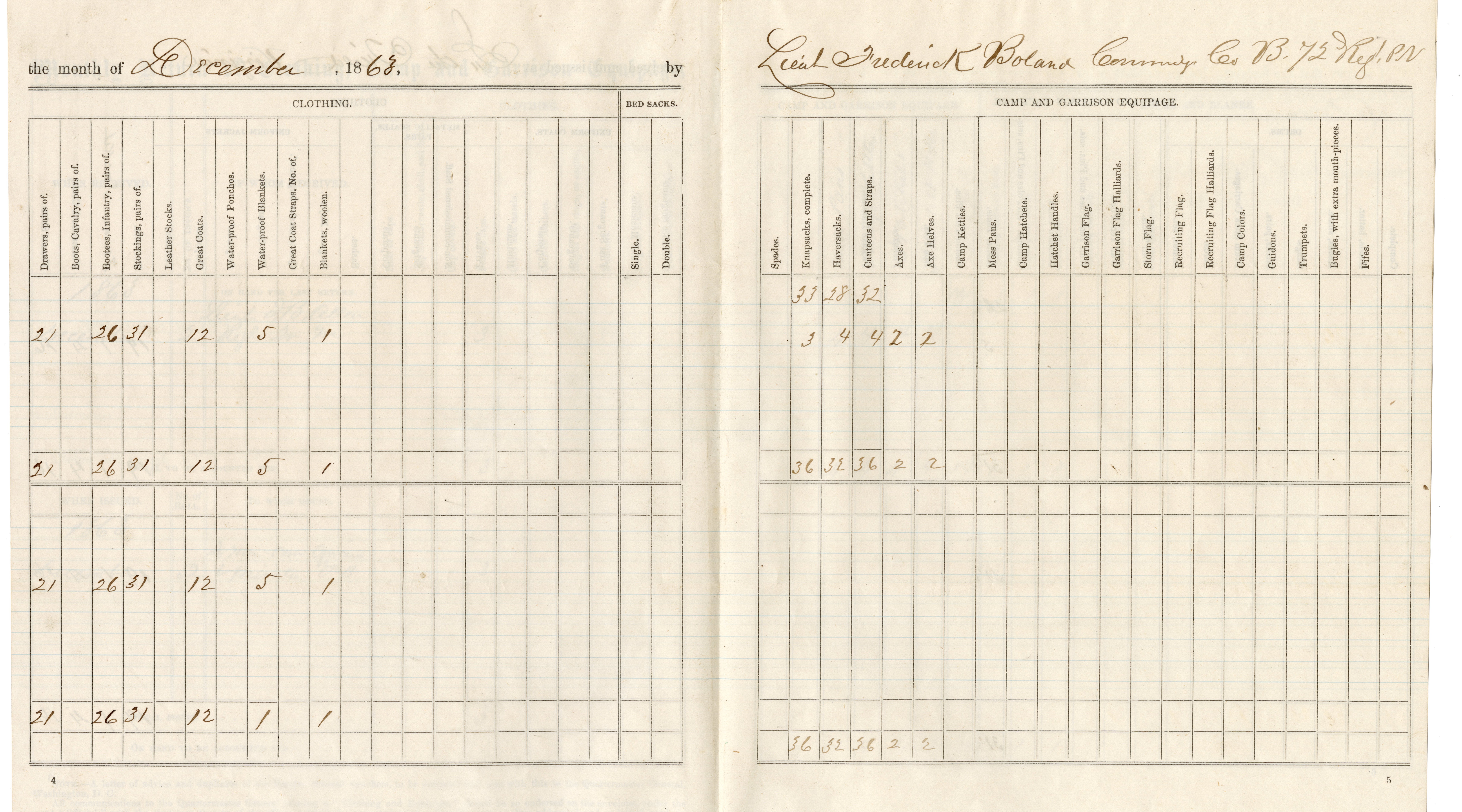 Original Civil War period document: Form No. 51, Monthly Return for Clothing, Camp and Garrison Equipage (8 pages) for Company B, 72nd Pennsylvania Infantry. Document is signed by Lieutenant Frederick Boland. Boland was wounded 4 times during his military service: