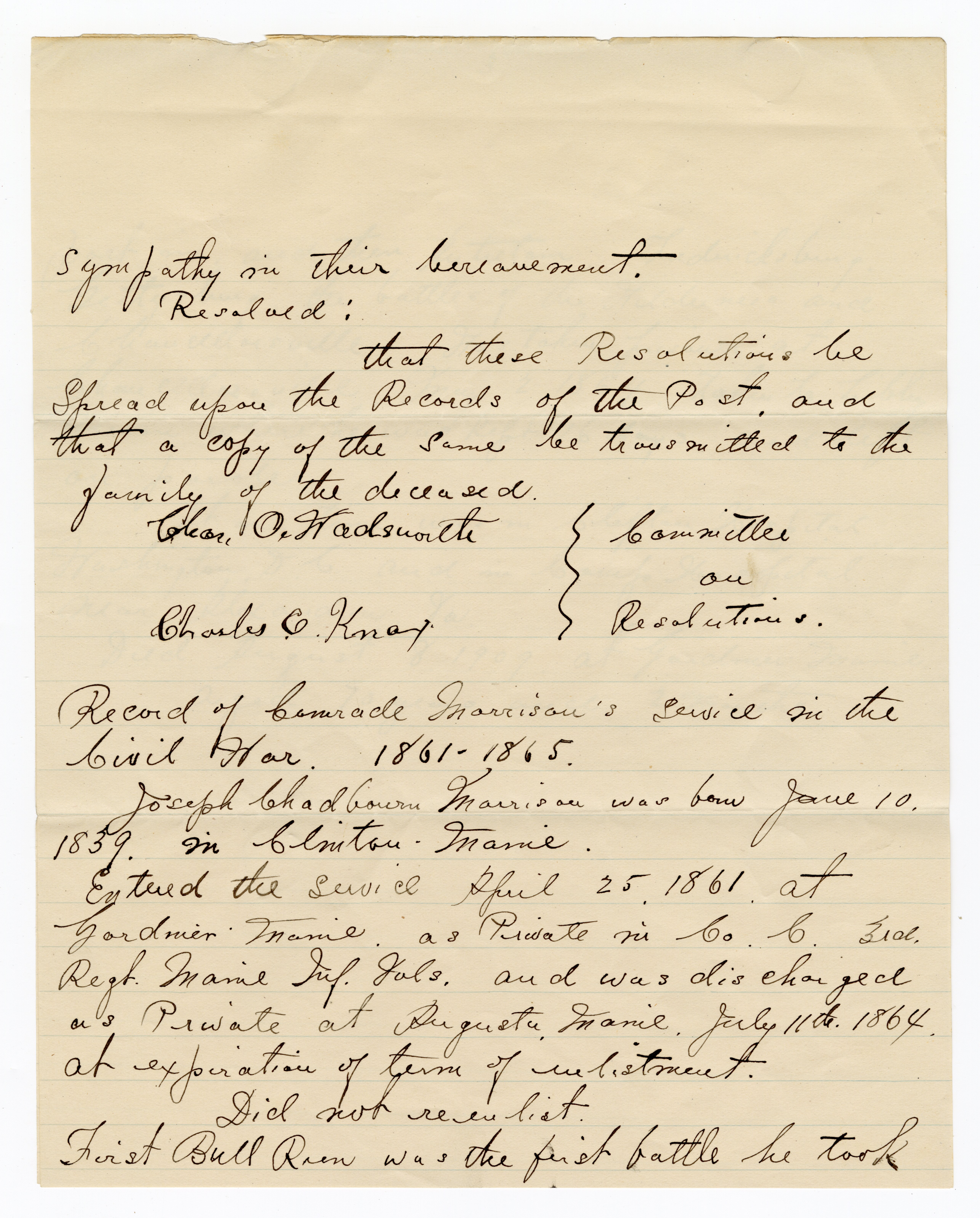 3 page Resolutions concerning the death of Joseph C. Morrison late of the 3rd Maine Infantry. Morrison served at 1st Manassas, Antietam, Fredericksburg, Gettysburg, Wilderness and Chancellorsville (where he was captured and sent to Libby Prison).