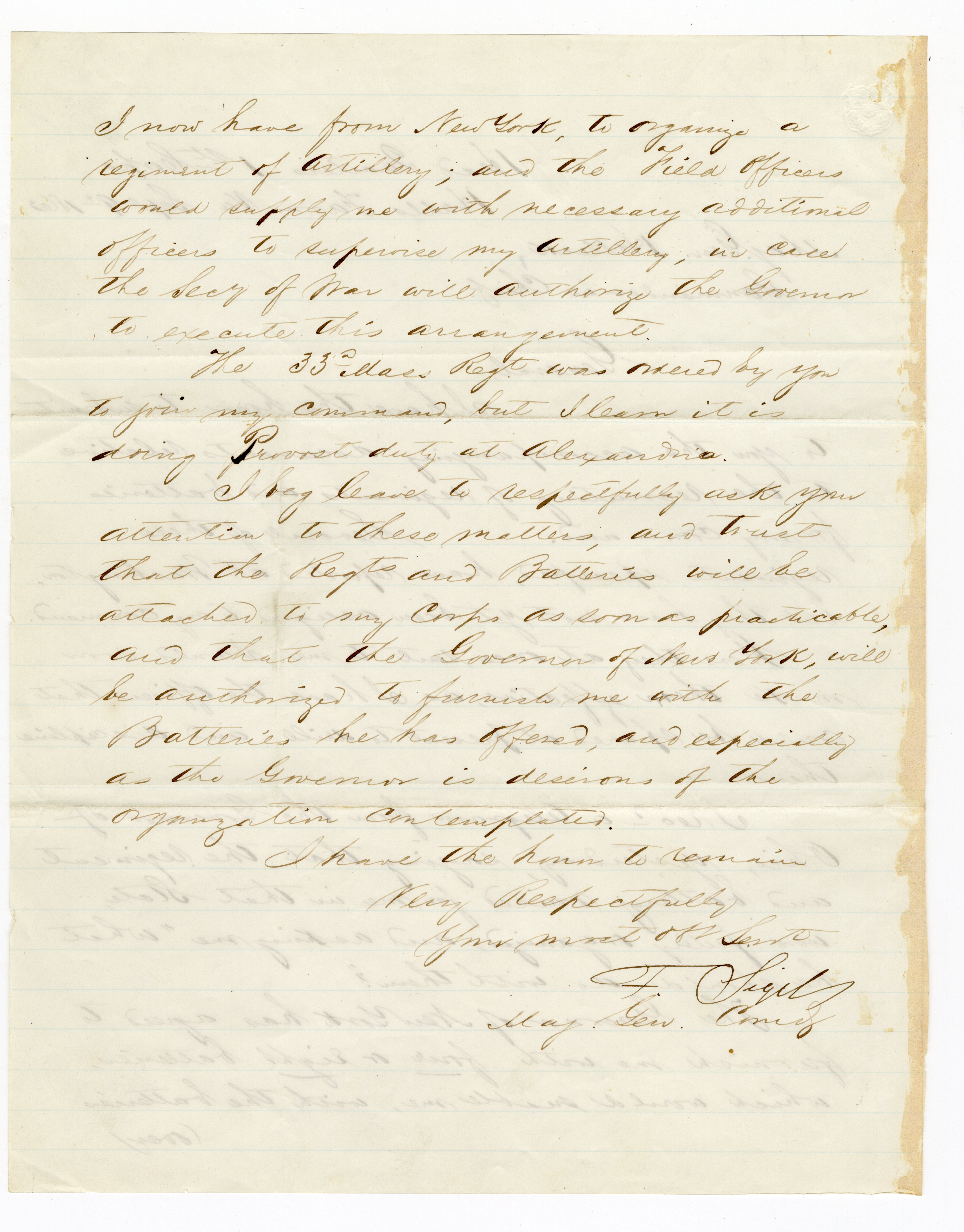 I beg leave to respectfully ask your attention to these matters, and trust that the Regiments and Batteries will be attached to my Corps as soon as practicable, and that the Governor of New York, will be authorized to furnish me with the Batteries he has offered, and especially as the Governor is desirous of the organization contemplated.