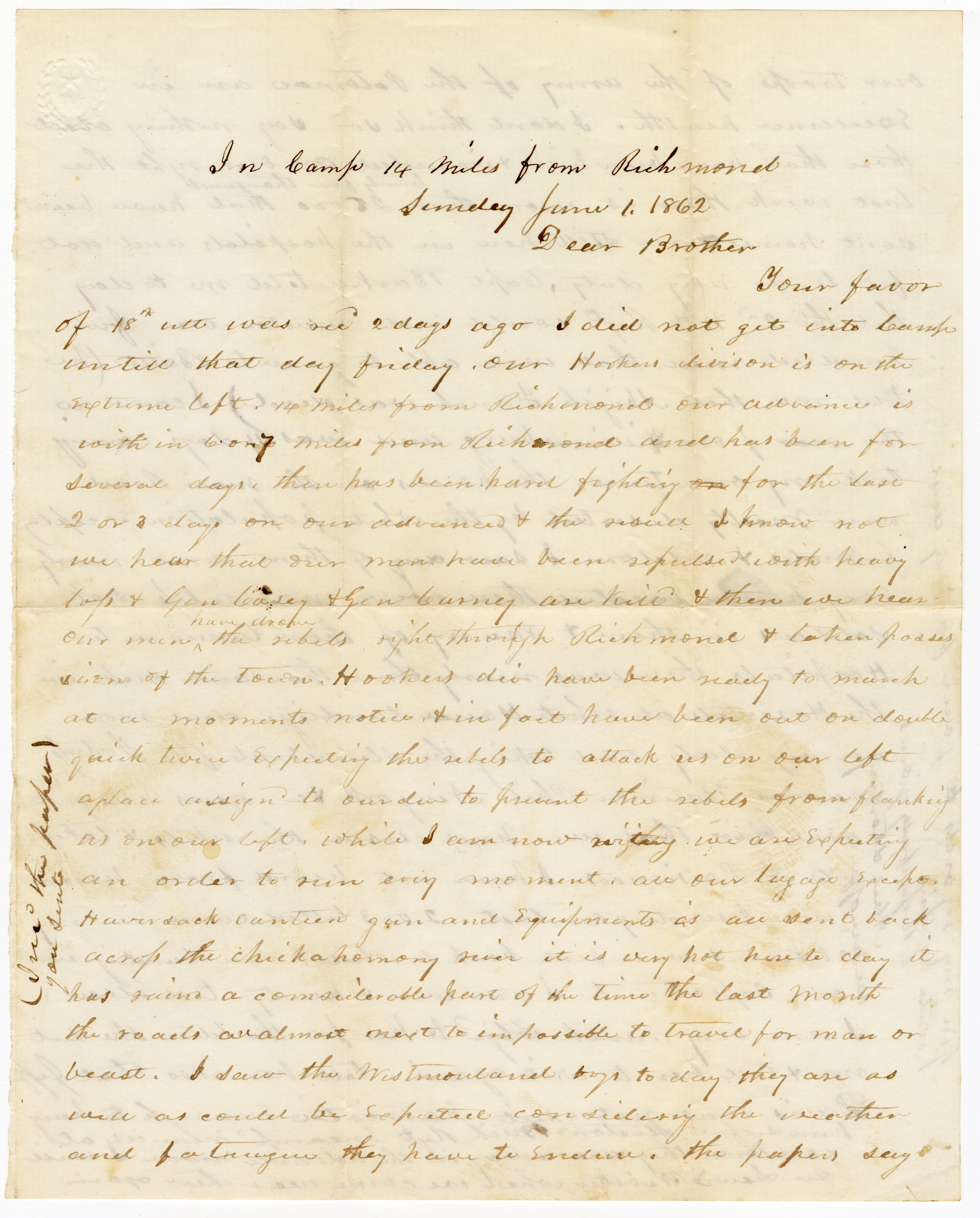 Your favor of the 18th instant was received 2 days ago. I did not get into camp until that day Friday. Our (Hooker’s) division is on the extreme left, 14 miles from Richmond. Our advance is within 6 or 7 miles from Richmond and has been for several days. There has been hard fighting for the last 2 or 3 days on our advance and the result I know not. We hear that our men have been repulsed with heavy losses and General Casey and General Carney are killed. And then we [also] hear our men drove the Rebels right through Richmond and taken possession of the town. Hooker’s Division have been ready to march at a moment’s notice and in fact have been out on double quick twice expecting the Rebels to attack us on our left—a place assigned to our division to prevent the Rebels from flanking us on our left. While I am now writing, we are expecting an order to run any moment.