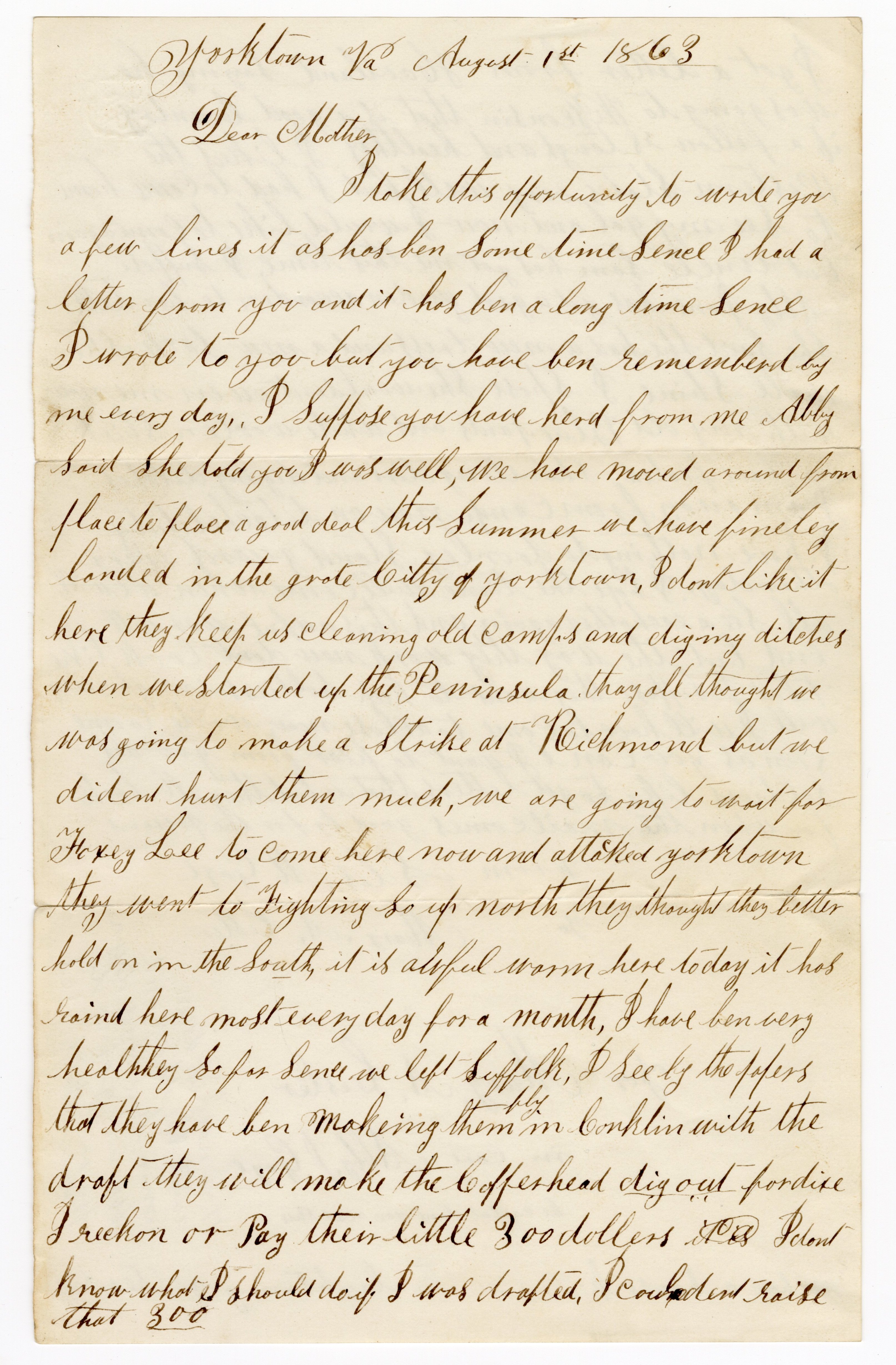 We have moved around from place to place a good deal this summer. We have finally landed in the great city of Yorktown. I don't like it here. They keep us cleaning old camps and digging ditches. When we started up the peninsula, they all thought we were going to make a strike at Richmond, but we did not hurt them much. We're going to wait for Foxy Lee to come here now and attack Yorktown. They went to fighting up north. They thought they'd better hold one in the south.