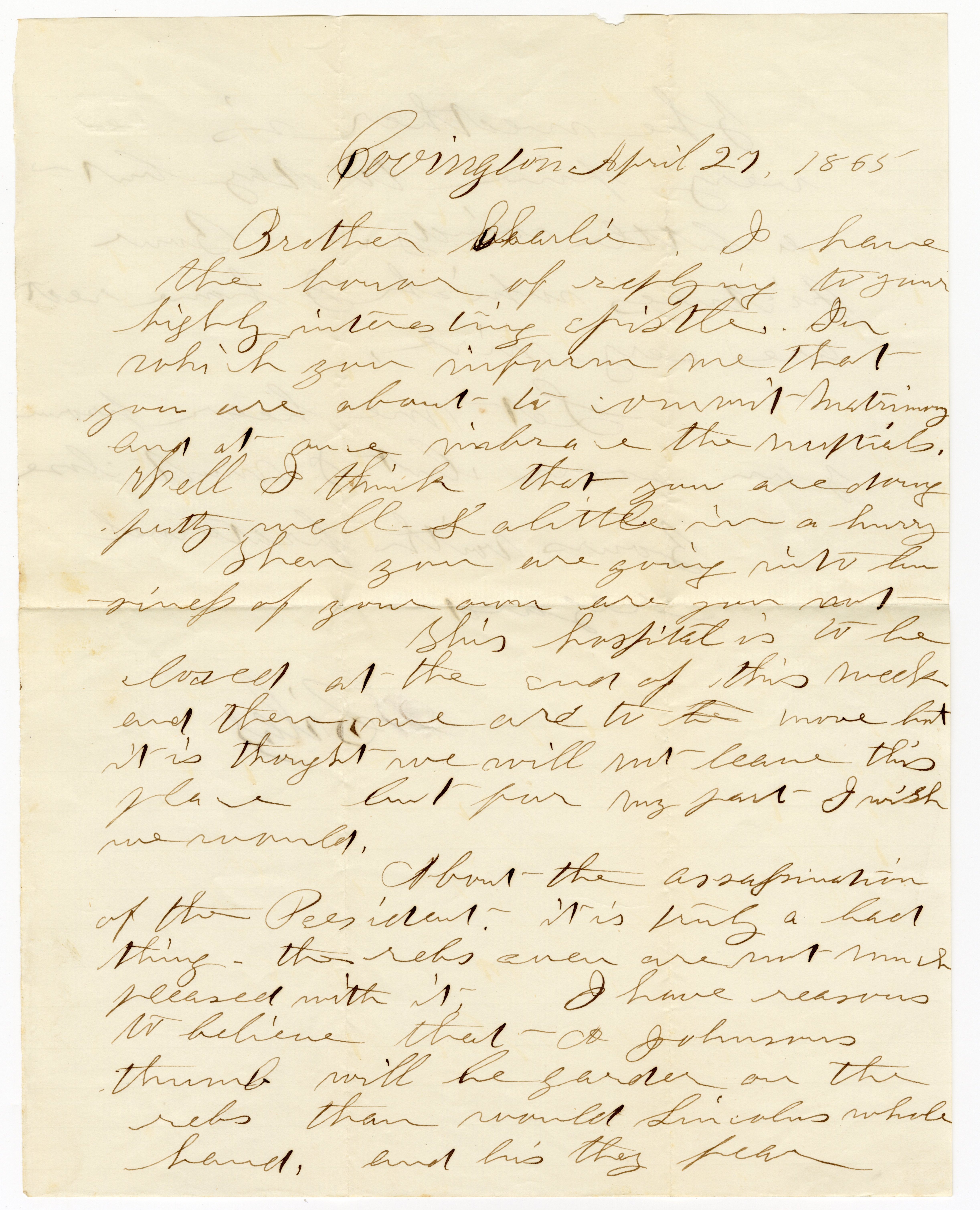 About the assassination of the president, it is truly a bad thing. The rebs are not much pleased with it. I have reasons to believe that the Johnson's thumb will be guarded on the rebs than would Lincoln's whole hand, and his, they fear.